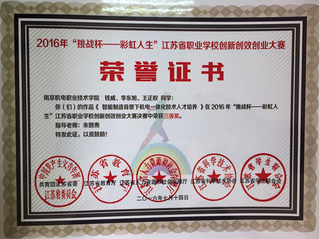 在2016年“挑战杯——彩虹人生”江苏省职业学校创新创效创业大赛决赛中,我院钱威、李东旭、王正权同学在朱妍焘老师指导下的作品《智能制造背景下机电一体化技术人才培养》获三等奖。本次比赛由共青团江苏省委、江苏省教育厅、江苏省人力资源和社会保障厅、江苏省科学技术协会、江苏省学联等单位联合主办。