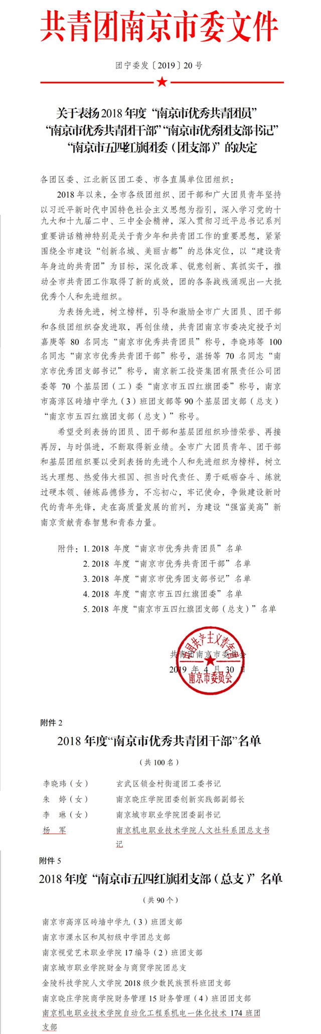 为表扬先进,树立榜样,引导和激励全市广大团员、团干部和各级团组织奋发进取,再创佳绩,共青团南京市委决定授予我院人文社科系团总支书记杨军为2018年度“南京市优秀共青团干部”称号,授予我院自动化工程系机电一体化技术174班团支部2018年度“南京市五四红旗团支部”称号。