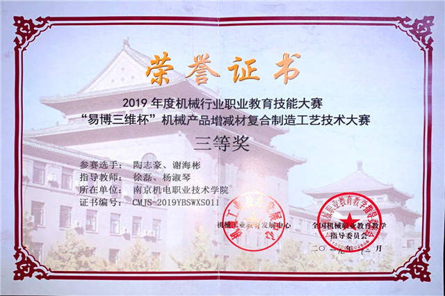2019年12月17日至20日,2019年度全国机械行业职业教育技能大赛“易博三维杯”机械产品增减材复合制造工艺技术赛项竞赛在兰州资源环境职业技术学院举办,本次比赛由机械工业教育发展中心和全国机械职业教育教学指导委员会主办,北京易博三维科技有限公司和兰州资源环境职业技术学院承办,来自全国16个省、市、自治区的21所学校的54名选手参加了比赛。