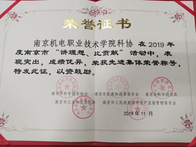 2020年1月3日,南京市科协十届四次全委(扩大)会议在南京科技馆召开,会上举行了首批“南京市企事业(园区)科技工作者之家示范基地”授牌仪式。学院科协作为南京市唯一一家高校科协、全市四家科协之一获得“南京市企事业(园区)科技工作之家2019-2024年综合类示范基地”,学院副院长刁爱军代表学院接受了铜牌。同时,学院科协被评为2019年度市级企事业(园区)科协工作先进集体,学院科协秘书长李木香被评为2019年度市级企事业(园区)科协工作先进个人。