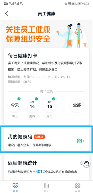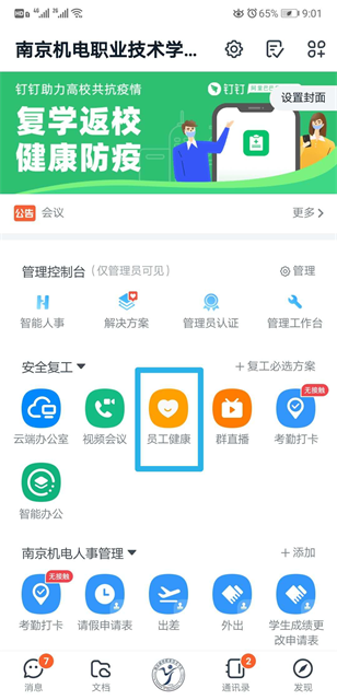 (1)进入钉钉工作台,找到“员工健康”点击进入。