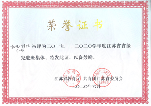 日前,江苏省教育厅、共青团江苏省委公布了关于表彰2020年度江苏省普通高校省级三好学生、优秀学生干部和先进班集体的决定,我院自动化工程系解恒雨同学荣获“江苏省三好学生”称号,人文社科系孙言、机械工程系叶华澳同学荣获“江苏省省级优秀学生干部”称号,自动化工程系机电一体化172班荣获“江苏省先进班集体”荣誉称号。