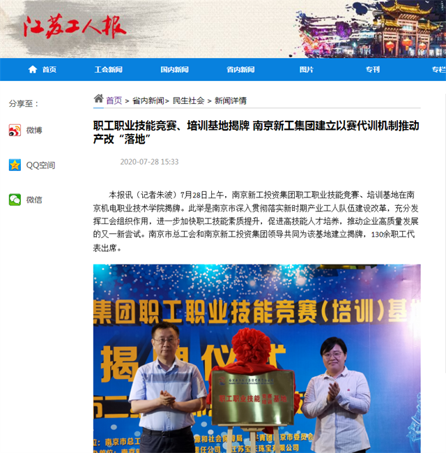 近日,江苏工人报网站、江苏工人报纸媒、江苏工会网、江苏省工会服务网报道了我院被南京新工投资集团命名为新工集团职工职业技能竞赛(培训)基地的报道,报道如下: