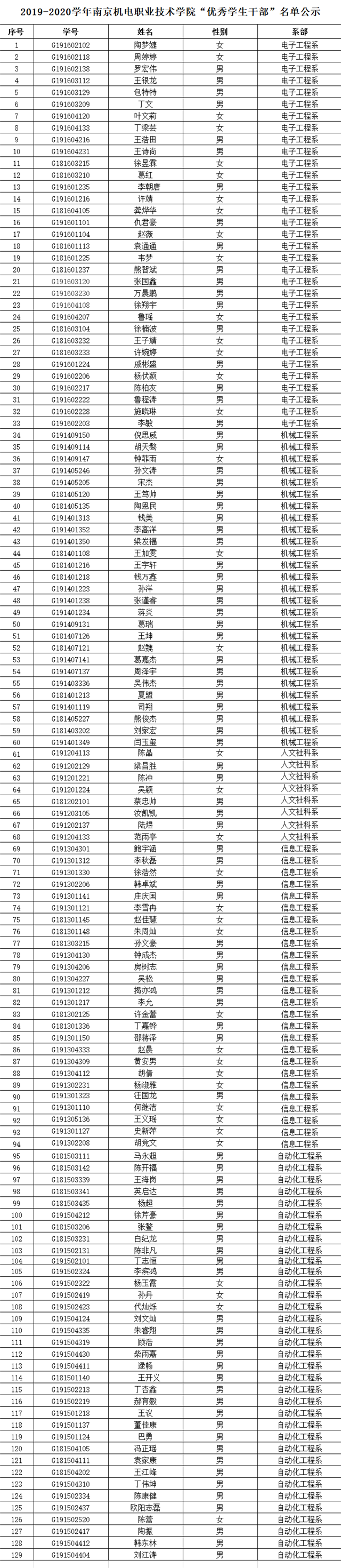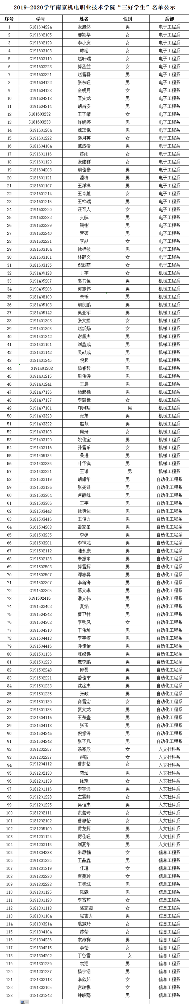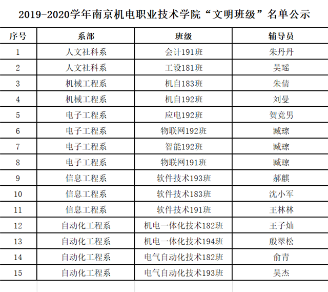 根据《乐玩体育2019-2020学年三好学生、优秀学生干部、文明班级评选通知》规定,经学生本人申请、班级评议,系部审核推荐,学工处核准,学校审批,在公平、公正、公开的基础上,拟评选出以下个人和班级为2019-2020学年乐玩体育“三好学生”、“优秀学生干部”、“文明班级”,现将名单公示如下。