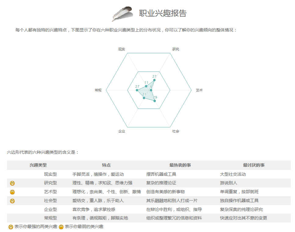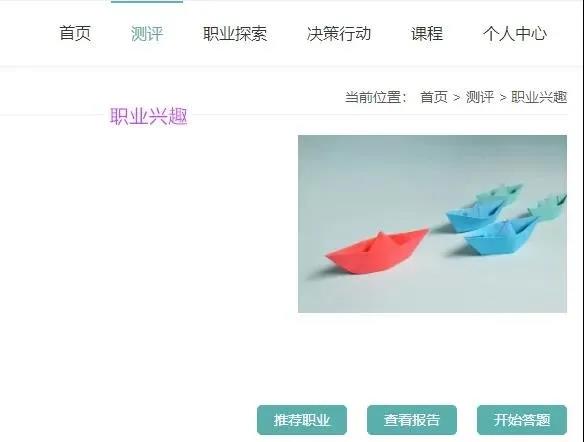 通过测试职业兴趣和职业胜任力两个方面,同学们可以了解自己的兴趣能力类型特点,获得大学专业推荐以及相关专业介绍。请点击“测评”选择“职业兴趣”,共94道题目,完成需要大约20分钟。