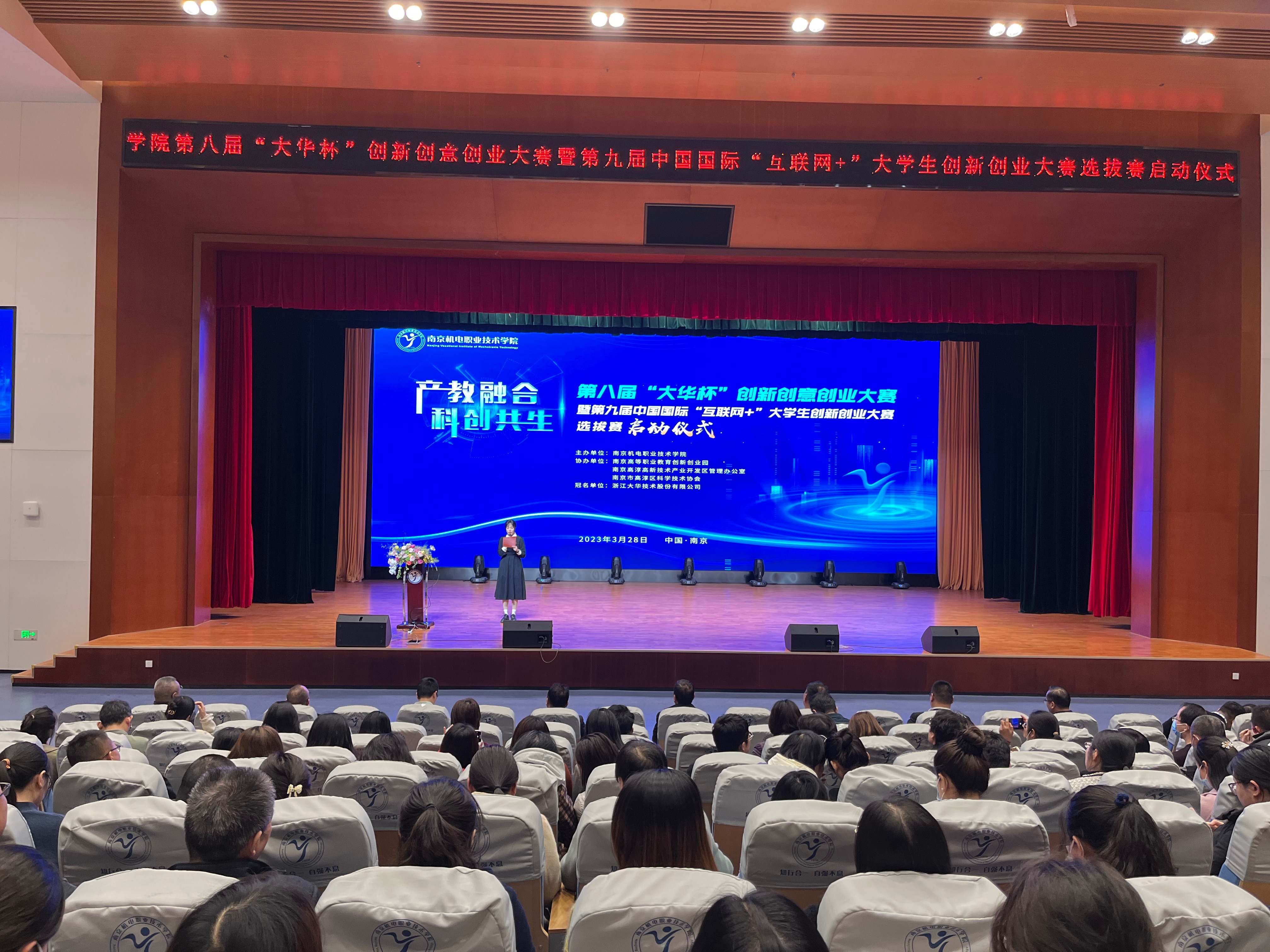 3月28日下午,学校第八届“大华杯”创新创意创业大赛暨第九届中国国际“互联网+”大学生创新创业大赛选拔赛启动仪式在青春剧场成功举办。南京高等职业教育创新创业园党工委委员、管委会副主任汪春荣,南京高淳高新技术产业开发区管理办公室分管负责人倪友谊,南京市高淳区科学技术协会副主席杨腊斌,浙江大华技术股份有限公司南京分公司总经理杨杰、南京办高溧组主任高国平,乐玩体育党委委员、副院长郭朝辉,党委委员、副院长赵学洪,党委委员、副院长刁爱军,党委委员、副院长孔德丽,党委委员、工会主席姜振宇出席启动仪式。学校全体师生参与活动。