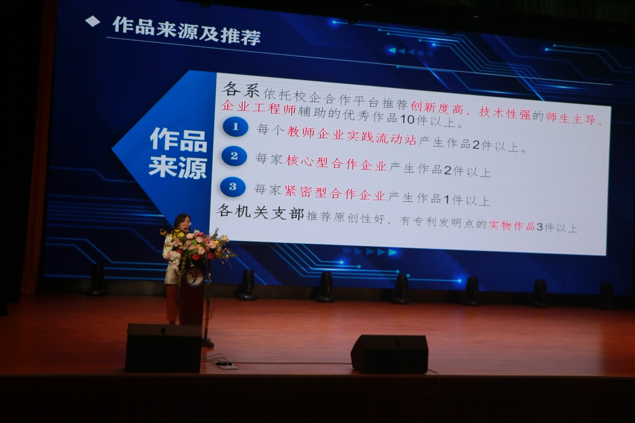 李木香介绍了本届大赛的赛事安排。大赛本着“以赛促教、以赛促学、以赛促创”的宗旨,根据作品的不同类型,分为创新制作组、创意设计组、创业实践组,设置宣传报名、初赛选拔、项目辅导、决赛预演、大赛决赛等五个阶段,设有一等奖5名、二等奖10名、三等奖15名、单项奖若干。本次大赛紧紧围绕“产教融合科创共生”的主题,重点关注校企合作项目,鼓励师生依托校企平台,与企业工程师共同创作优秀作品,优先推荐源自校企合作项目的作品。