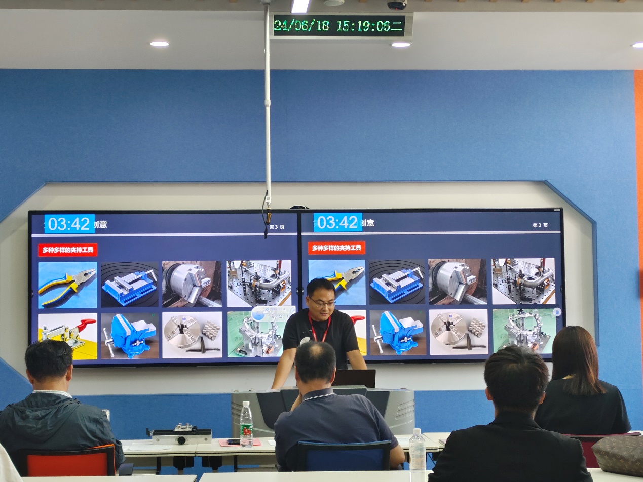 本场决赛根据创新制作、创意设计、创业实践三个组别分为三个赛场,采取“项目演说+现场陈述答辩”的形式举行。 在创新制作组,来自蓝岛创客空间教师黄克瑶的《一种可调钳口的台钳》项目通过模块化钳口设计,现快速更换以适应长方体、圆柱体及异形件等多样化工件,以适应不同形状工件的夹持需求并利用独特的机械结构,钳口可以多角度旋转和倾斜,配合高精度夹持力控制系统,确保夹持的稳定性和精度。来自学校机械工程系学生殷栎涵的《一种基于人工智能的自动车库门自动关门装置》项目旨在开发一款基于立创梁山派 GD32F470ZGT6 核心处理器、华为 NearLink 星闪移动通信技术和 Wireless Fidelity STA 接入点通信技术的智能车库门控制系统,并接入米家平台,实现与小米 Su7 车机语音助手 (小爱同学)的自然语言AI 识别技术对接,实现语音控制车库门的功能。