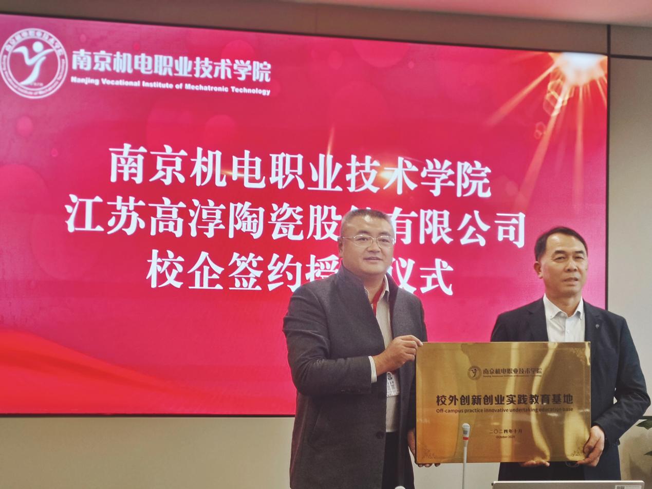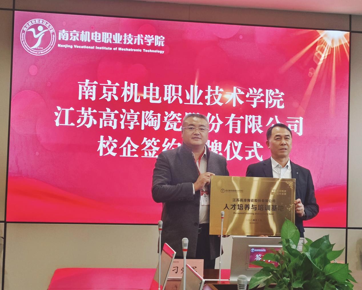 在与会人员的见证下,学校党委委员、副校长刁爱军与江苏高淳陶瓷股份有限公司党委副书记周玉明共同签署了校企合作协议,并进行了授牌仪式。本次签约授牌仪式标志着双方将在人才培养、文化传播、技术创新、社会服务等多个领域展开深入合作。