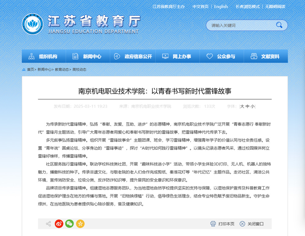 报道链接:江苏教育 高校动态 乐玩体育:以青春书写新时代雷锋故事