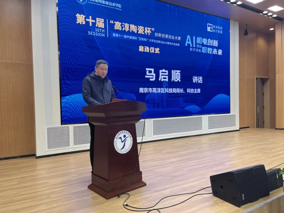 2025年3月18日,“AI驱动机电创新,数字领航职教未来”乐玩体育第十届“高淳陶瓷杯”创新创意创业大赛暨第十一届中国国际“互联网+”大学生创新创业大赛校内选拔赛启动仪式在乐学楼102报告厅举行。南京市高淳区科技局局长、科协主席马启顺,南京高淳高新技术产业开发区管理办公室分管负责人倪友谊,南京高等职业教育创新创业园发展服务中心主任吴凯,江苏高淳陶瓷股份有限公司党委副书记、副总经理周玉明,学校党委委员、副校长刁爱军等领导出席启动仪式。300余名师生代表参加活动,共同见证大赛开幕。