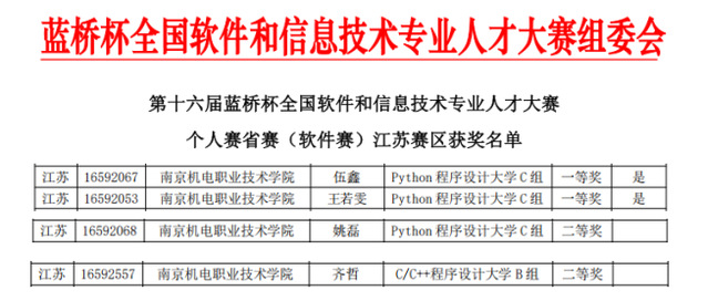 近日,第十六届蓝桥杯全国软件和信息技术专业人才大赛在南京财经大学拉开帷幕。学校信息工程系软件技术与云计算技术应用专业学子凭借扎实的专业功底与创新能力,在国赛与省赛中斩获多项荣誉:云计算技术应用专业伍鑫以全国排名第二的成绩勇夺国赛一等奖,软件技术专业王若雯晋级国赛并展现出色竞技水平;此外,在江苏省赛中,伍鑫、王若雯分别以全省第4、第 5 名的成绩斩获 Python 方向省赛一等奖,姚磊获 Python 方向省赛二等奖,齐哲获 C/C++ 方向省赛二等奖,6 人参赛团队实现奖项全覆盖,充分彰显专业实力。