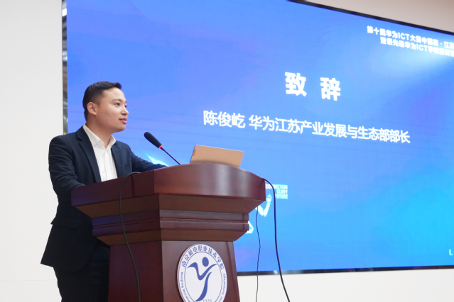 紧接着,华为江苏产业发展与生态部部长陈俊屹致辞。他肯定了乐玩体育在ICT人才培养方面的成效,强调华为将持续发挥技术与生态优势,深化与学校的合作,为职业教育注入动力,助力青年学子实现职业成长。