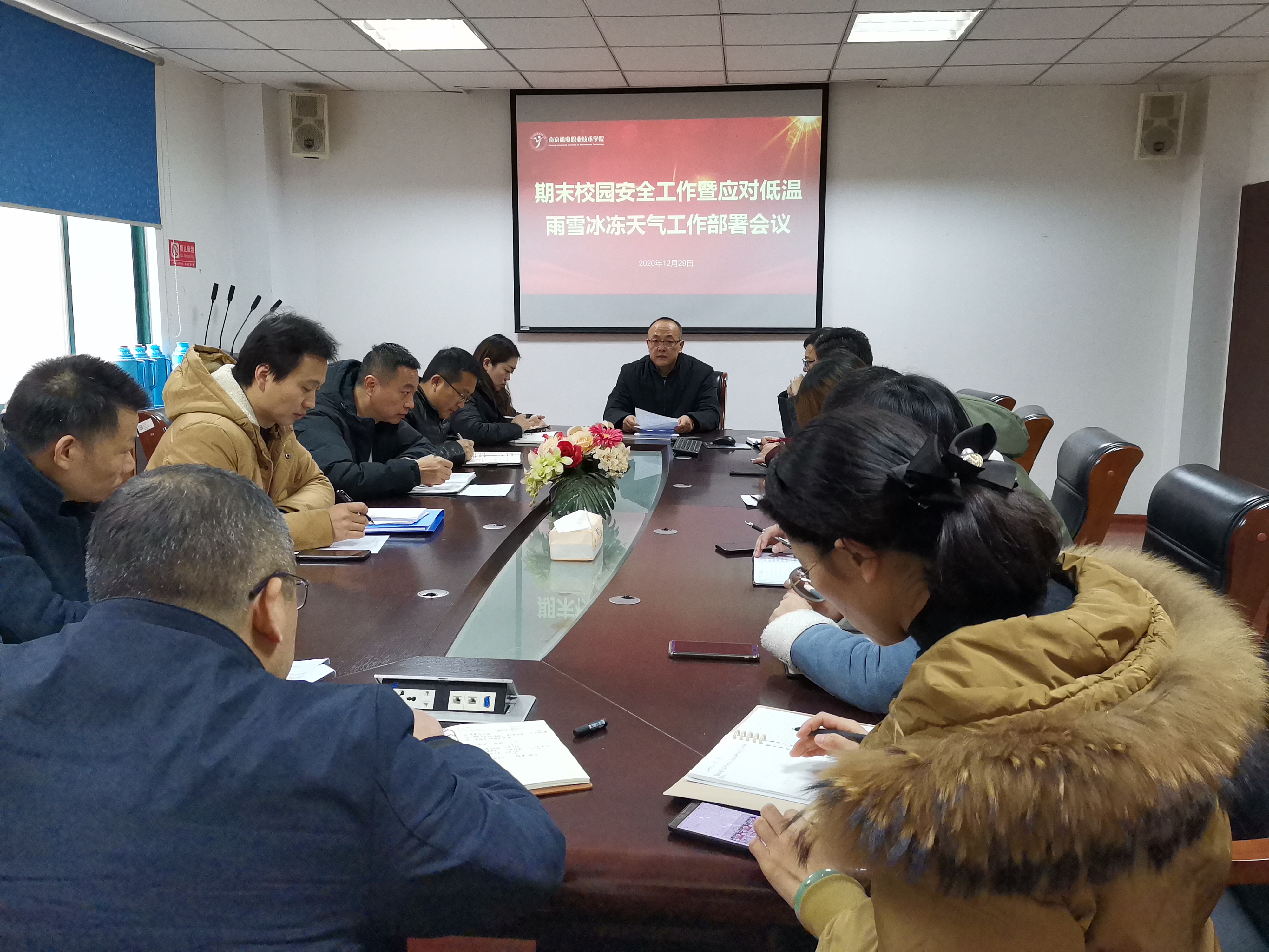 会上,赵院长传达了省、市校园安全工作相关文件精神;对近期将出现的低温雨雪冰冻等恶劣天气应对工作做了布署;就扫雪区域做了划分;对新校区迁建工作和期末校园安全工作进行了具体安排;严格落实疫情防控各项措施,做好个人防护工作。