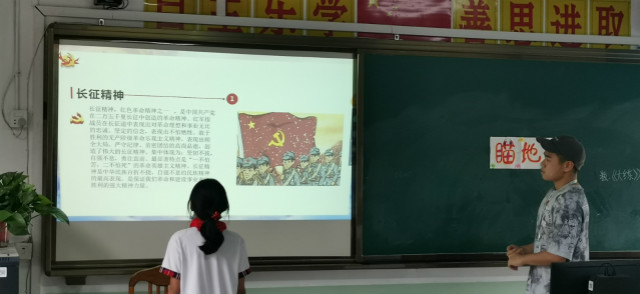 宣讲主题班课上,主讲人陈童和龚燕明同学,通过一个个生动有趣的小故事向港口小学的青少年讲述了长征过程中红军四渡赤水的机智、飞夺泸定桥的英勇、过雪山时的艰难、过草地时的坚强以及最后三军会师的壮观景象。形象的表述了“长征精神”的四大主要内涵——乐观主义、英雄主义、创新胆略、集体主义。让青少年认识并感受“长征精神”,对于他们今后的学习、生活都有着重大的指导意义。