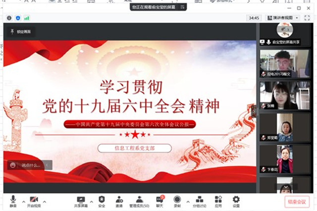 3月29日,信息工程系党支部在疫情期间坚持学习防疫两不误,支部结合当前防疫形势,配合主题党日活动,依托腾讯会议开展线上政治理论学习,进一步提升党员先进性,引导党员立足本职、同心战“疫”。会议由支部书记吴伟萍主持,支部全体教职工参加会议。