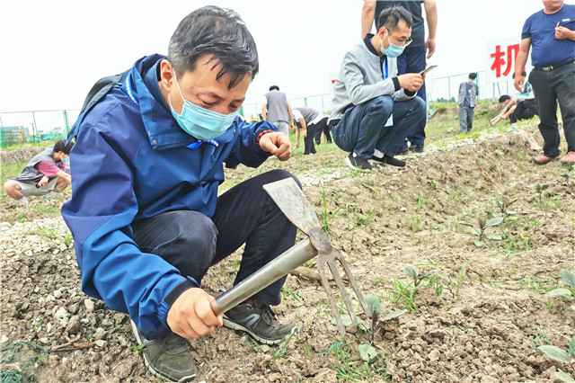 实践基地的蔬菜园里前期已经播种下了茄子、黄瓜、辣椒等蔬菜种子,长势喜人,但也夹杂着许多野草,拔去杂草,蔬菜才能更好地生长。经过讲解员的细致讲解,全体同志干劲十足,撸起袖子下地干活,除草的除草、翻地的翻地,活动现场呈现出热火朝天的劳动景象。