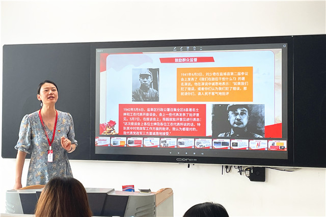 杨劲静老师用《东征初抵高淳》组诗开启了本次政治学习的序幕,从诗的由来和描绘的场景,展开了“新四军群众路线概述”“新四军群众路线的必要性”“新四军群众路线的实践”三方面的讲解。