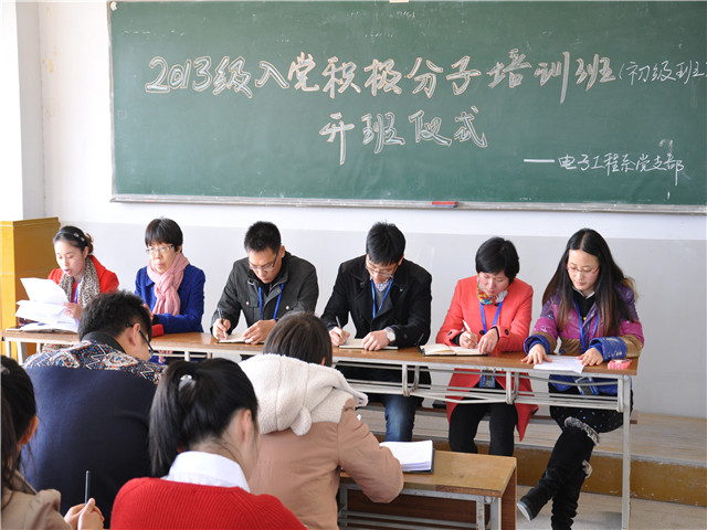 11月18日中午12:30,乐玩体育电子工程系党支部在教学楼A208举行2013级入党积极分子初级班培训开班仪式。电子工程系党支部书记张宝中,宣传委员梁金平,组织委员林雪,党员惠珍、权海平、杨瑞以及31名积极分子学员参加了此次开班仪式。仪式由林雪老师主持。