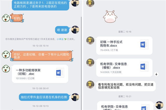 自2019年9月入学以来,戚珉恺利用晚自习时间帮助学习上有困难的同学补习《电工基础》等课程。在《创新思维训练》课上,杨阳老师的讲解使他充分了解了专利的相关知识,并与专业班主任老师认真讨论,写下了自己的第一份专利交底书,并向国家知识产权局提交了专利说明书。在疫情期间,戚珉恺萌生了新的想法,在与老师沟通修改后递交了第二份专利说明书。