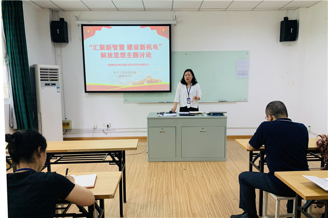 解放思想是我党思想路线的本质要求,是发展中国特色社会主义事业的一大法宝,也是我院在适应新形势、战胜新挑战、推动大发展、实现新跨越过程中的重要法宝。7月10日下午1点,电子工程系党支部全体教职工于博学楼307开展了主题为“汇聚新智慧 建设新机电”解放思想讨论活动,此次活动由电子工程系党支部书记吴伟萍主持。