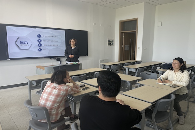 无人机应用技术专业教师郁镭首先介绍了本专业及传统教学模式的特点。作为近年来关注度越来越高的新兴专业,它具有跨学科性、实践性强、创新性强、应用领域广泛等特点,但传统的先理论后实践的教学方法导致学生缺乏学习兴趣,同时实践教学相对单一,这也使学生即使很快学会操作无人机,却在面临应用领域时无所适从;教学内容滞后使学生所学知识与行业实际需求脱节;教学评价方式单一难以全面评估学生的实践能力、创新思维和团队协作精神等方面的素质。接着她结合目前该专业正在进行的项目化改革展示了相关成果,包括项目的选定和设计思路,活页式教材的撰写情况等。最后她列举了目前改革过程中面临的困难和挑战。对以上问题,教研室成员展开了热烈的研讨。