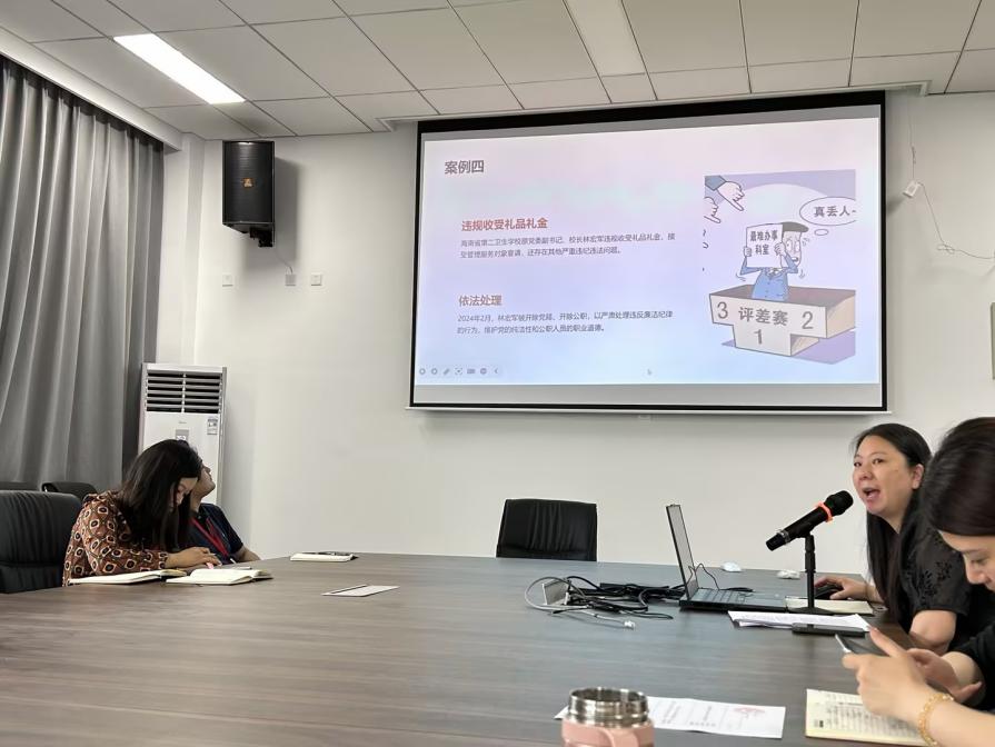党课上陈雪列举了10则在教育领域中违反廉洁纪律的典型案例,她以案例出发,结合《中国共产党纪律处分条例》中与案例对应的内容给党员们进行剖析,通过列出案例、对照条例、提出问题、总结防范四个角度引导党员、干部学纪、知纪、明纪、守纪,推动党纪学习教育走深走实。