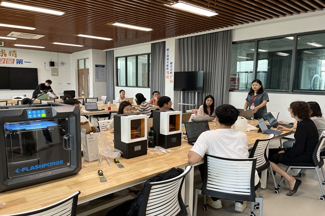在培训过程中,周大喜展现了其扎实的理论功底与丰富的实践经验。培训内容系统全面、层层递进。他首先从技术原理入手,清晰阐述了3D打印的技术优势与发展脉络,并重点介绍了FDM(熔融沉积成型)、SLA(光固化)等主流技术的特性与应用场景。随后,应用无人机产业学院的3D打印设备,详细演示了从三维模型设计、切片软件参数设置到打印机操作的全流程,并针对常见问题提供了专业的解决方案。在互动环节,周工程师就教师们关心的如何将3D打印应用于学科竞赛及具体课程教学等问题,给予了耐心细致的解答,现场交流气氛热烈。