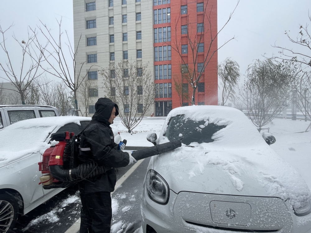 由于过往车辆多,车辆碾压过的道路如同一个大的溜冰场,大家不畏严寒,你铲我扫、分工明确,相互配合、干劲十足,一点点地将积雪和冰清扫干净并堆放到统一位置。大雪纷飞,老师们的车辆上也堆积上厚厚的积雪,为了老师们出行安全,物业工作人员自制车辆除雪工具。经过不懈的奋战,物业工作人员用自己的辛劳为师生开辟出一条条安全通行的道路。清洁的道路给大家带去的不单单是方便、安全,更传递了一份温暖和正能量。