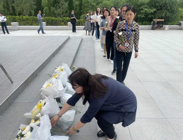 当天下午,该系全体党员教师,排着整齐的队伍,迈着沉重的步伐,怀着崇敬的心情,肃立在刻着“革命烈士永垂不朽”的纪念碑前,我系主任佟静同志和徐磊同志将敬献的花篮摆放在纪念碑前,仔细整理好缎带之后,带领参加活动人员向革命先烈鞠躬致敬,低头默哀,重温入党誓词,向革命烈士表达无限敬意与哀思。