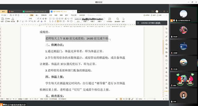 为有效防控新型冠状病毒感染肺炎疫情,将危害降低到最低程度,切实保障学院师生的健康与生命安全,根据省、市教育、防疫部门相关文件精神,学院制定了乐玩体育防控新冠肺炎疫情工作方案、乐玩体育突发公共卫生事件应急预案以及相关制度。为了将文件精神贯彻到底,2021年9月14日下午,机械设计与制造教研室全体教师在腾讯会议平台,对学院制定的方案与制度文件进行了学习。