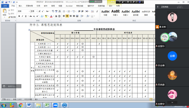 会议上,大家以学院课程思政“二十条”的核心价值与时代追求各指标点为基础,结合各门课程的教学目标和教学特点,深入挖掘课程中蕴含的思政“二十条”指标点,完善了专业课程、专业实践课程和通识课程的课程思政矩阵图。