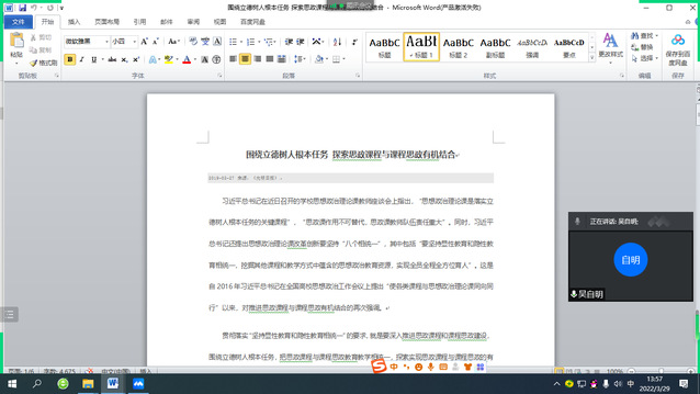 为了落实立德树人根本任务,深入推进课程思政教育教学改革,全面提升工业设计专业老师课程思政建设和能力,3月29日下午,工业设计教研室开展课程思政理论学习与研讨,杨淑琴老师主讲。