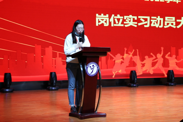 会议在雄壮的国歌声中拉开了序幕,学生代表茅旭升为即将开始的岗位实习发出倡议,辅导员代表王潇然结合自身上学时的实习经历给现场同学做了分享。