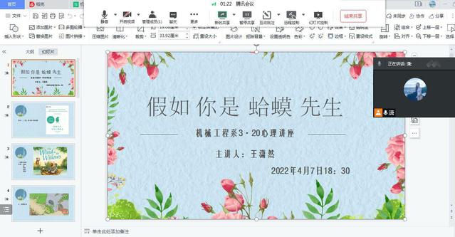 为帮助同学们更好地认识心理学和心理咨询,更好地运用多种渠道进行助人自助、求助互助,2022年4月7日18:30,由机械工程系王潇然老师主讲的“假如你是蛤蟆先生——浅谈心理咨询”3·20系列专题培训讲座,准时在腾讯会议平台上开展,机械工程系全体心理委员以及各系心理委员共计165人参加了本次培训。