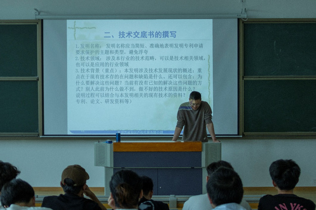 讲座中,江苏致邦律师事务所、芜湖思诚知识产权代理有限公司、江苏圣典律师事务所分别围绕专利基础知识、技术交底书的撰写技巧、专利挖掘、发明专利的撰写请求及如何提高授权率进行讲解。详细介绍了专利的概念、专利申请知识、专利申请文件、专利申请程序、申请专利的准备等内容。细致讲述了专利申请的流程和请求书、权利要求书、说明书等专利文件的组成部分,并通过实例,重点介绍了专利说明书中技术领域、背景技术、发明内容、有益性效果等内容的撰写要求。