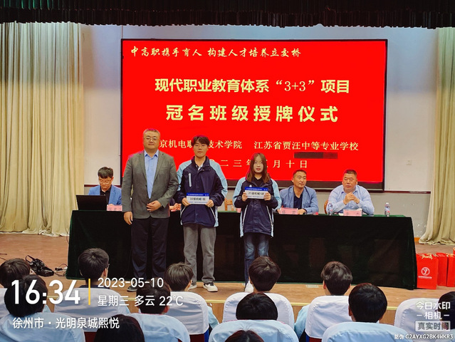 然后,杨春雷处长宣读江苏省现代职教体系“3+3”项目优秀学生的表彰决定,刁爱军院长为获奖学生颁发证书,并为江苏省贾汪中等专业学校22级机械1班和21级机械1班授项目冠名班级牌。