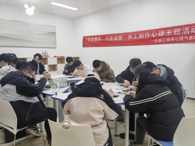 为贯彻落实“重塑心秩序 青春再启航——大学生心理健康教育江苏行”主题教育活动的文件精神,丰富同学们的校园文化生活,感受与伙伴同行、共同成长的美好,同时珍惜身边的同伴,让同学们成为守护自己心理健康的第一责任人,机械工程系心理气象站于2023年11月28日中午在星梦馆一楼大学生健康成长中心的团体辅导室开展了一次名为“平安喜乐,巧手成香”的香囊制作手工活动。