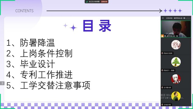 当晚,班主任赵一楠通过腾讯会议线上召开了班会,主要强调了四点内容。首先,他对学员们进行了实习安全教育和防暑降温提醒,确保大家在即将到来的实习期间能够注意个人安全和健康。其次,他再次明确了后期的上岗条件,包括体重、资格证书等要求,希望学员们能够提前做好准备,时时刻刻严格要求自己。然后,他详细说明了毕业设计和第五学期工学交替期间的课程和工作安排,要求学员们合理规划时间,确保学业和实习的顺利进行。最后,他还对学员们在假期中的专利工作进行了检查,并鼓励大家继续积极投入南钢的发明和创新。
