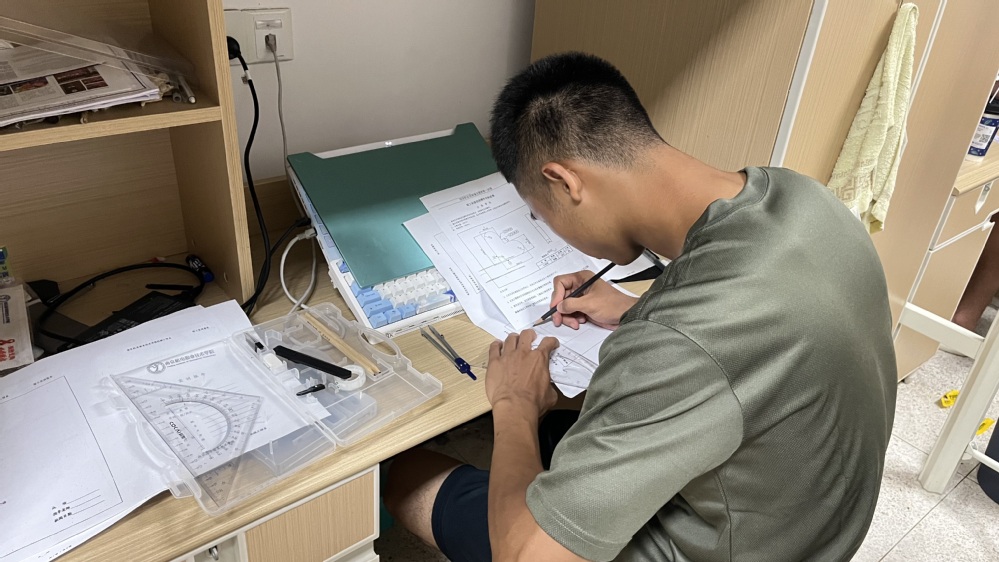 虽然军训安排紧锣密鼓,但仍以学习为重,辅导员在晚上查寝时,发现时浩男同学在认真完成白天的功课,军人的自律展现得淋漓尽致,吾辈当自强有了具体模样。