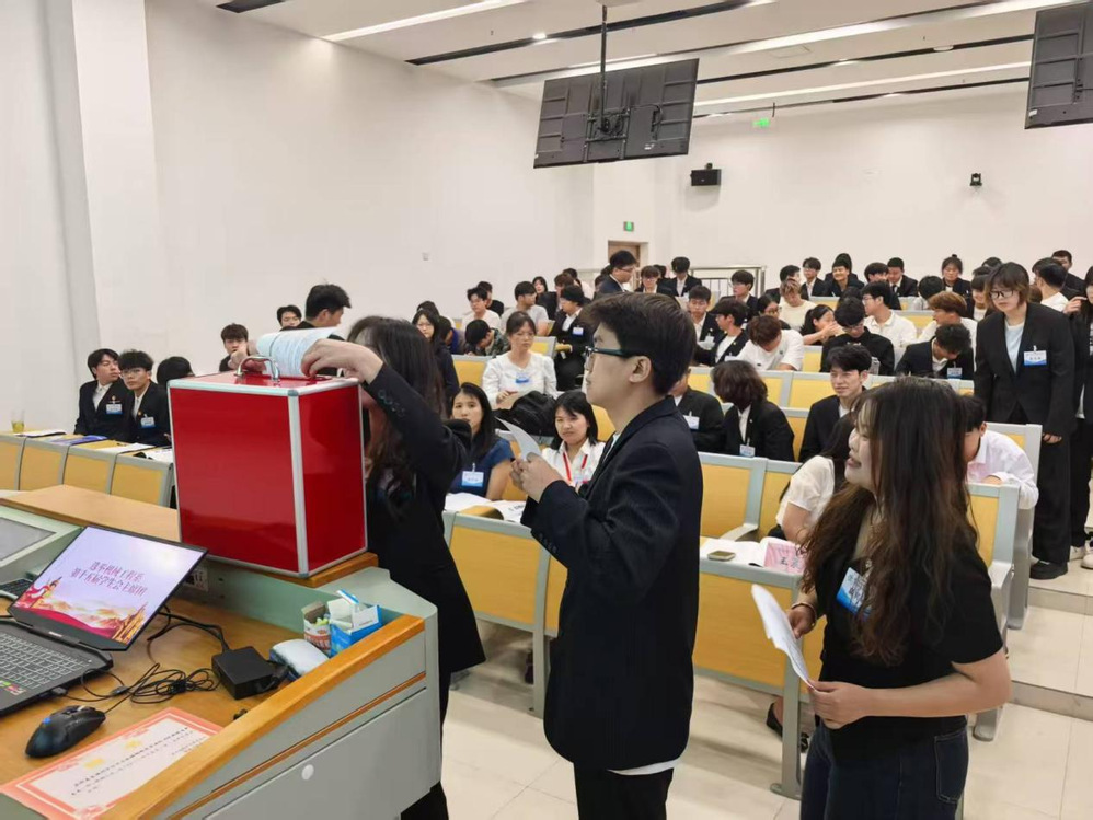 随后,大会步入投票选举阶段,现场秩序井然。代表们依次走上讲台进行投票,通过差额选举的方式,6名候选人中孟浏、汪翔、陈文聪同学脱颖而出,成为乐玩体育机械工程系第十五届学生主席团成员。