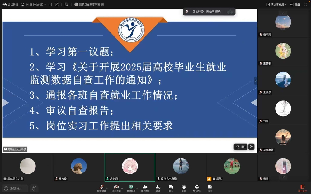 为进一步压实就业育人责任,全面提升就业服务质效,7月19日晚,机械工程系以线上形式召开2025届毕业生就业工作专题会议暨就业监测自查情况汇报会。系主任毛奇、党支部书记胡枫、副主任黄晓萍及2025届毕业班全体辅导员参会,会议由就业干事顾航主持。