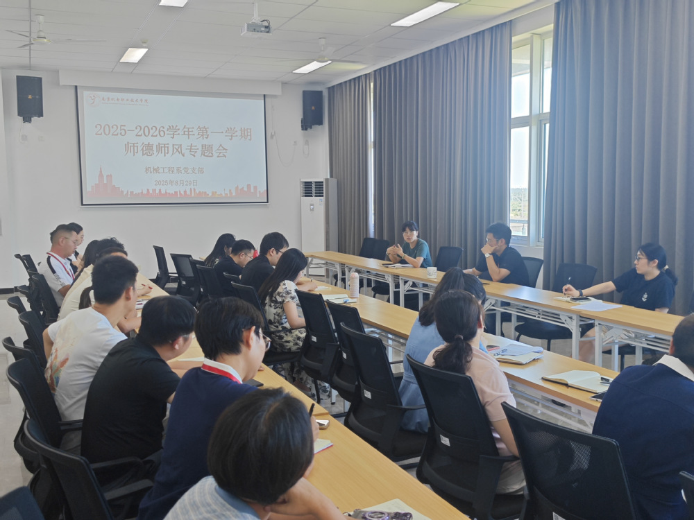 2025年8月29日,机械工程系党支部在笃行楼401会议室成功召开2025-2026学年第一学期教职工师德师风专题会。此次会议聚焦师德师风建设,旨在提升全系教师的职业道德素养,强化立德树人意识,为新学期教育教学工作注入强大的精神动力与思想支撑。