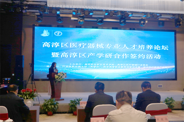 为促进高淳区医疗器械行业产业高质量发展,提高人才培养水平和科技创新能力,进一步服务区域经济发展,2022年5月13日,高淳区医疗器械专业人才培养论坛暨高淳区产学研合作签约活动在高淳区紫荆花园酒店举行。本次论坛及签约活动由乐玩体育、高淳区医疗器械行业协会主办,江苏科技镇长团、南京高等职业教育创新创业园、南京医疗器械产业园协办。南京市市场监督管理局二级巡视员蒋永兆,高淳区人民政府副区长张成,副区长刘敏,江苏高淳经济开发区管委会主任杨时平,南京市场监督管理局医疗器械监管处副处长沈洲,南京高等职业教育创新创业园党工委书记刘宜军,高淳医疗器械行业协会理事长江文养,高淳医疗器械行业协会秘书长连儒强,乐玩体育党委书记、院长周庆礼,党委委员、副院长刁爱军等领导出席活动,江苏科技镇长团(高淳团)、高淳区市场局、科技局、工信局、人社局、医疗器械园推进办、乐玩体育系部领导以及南京医疗器械产业园八家龙头企业等60余嘉宾参与活动。本次活动由科研及校企合作处处长李木香主持。