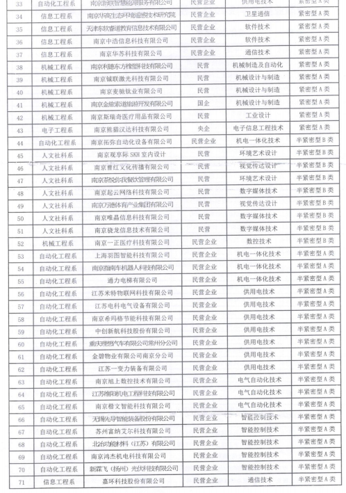 经科研及校企合作处初审、现场汇报答辩、专家评审,认定南京冠盛汽配有限公司等27家为核心型企业、认定南京福加自动化科技有限公司等16家企业为紧密型合作企业、认定南京旭上数控技术有限公司等65家为半紧密合作企业。