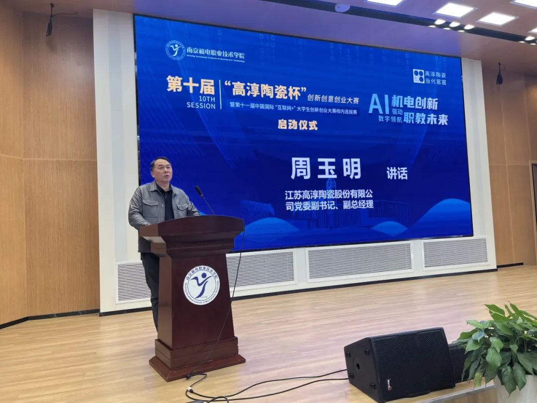 2025年3月18日,“AI驱动机电创新,数字领航职教未来”乐玩体育第十届“高淳陶瓷杯”创新创意创业大赛暨第十一届中国国际“互联网+”大学生创新创业大赛校内选拔赛启动仪式在乐学楼102报告厅举行。南京市高淳区科技局局长、科协主席马启顺,南京高淳高新技术产业开发区管理办公室分管负责人倪友谊,南京高等职业教育创新创业园发展服务中心主任吴凯,江苏高淳陶瓷股份有限公司党委副书记、副总经理周玉明,学校党委委员、副校长刁爱军等领导出席启动仪式。300余名师生代表参加活动,共同见证大赛开幕。