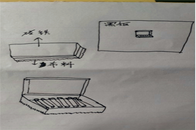 让粉笔盒子与粉笔擦结合起来。如图所示,上面有一层磁铁,可以再不用的时候直接贴在黑板上。底面是用来擦黑板的布料,其中,中间是可以打开的。中间打开后是可以储存一盒粉笔。并且这个黑板擦上面的磁铁是强力磁铁。贴合黑板上时可以下图所示打开,取出其中的粉笔。