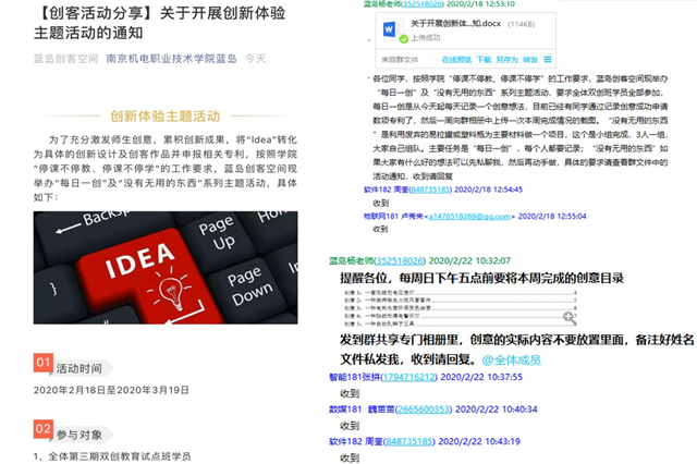 在有效防控新型冠状病毒感染肺炎疫情的前提下,为确保学院创客相关工作有序开展,蓝岛创客空间办公室坚决执行学院制定的2020年春季学期延期开学教学工作方案,并于2月19日通过微信公众号,QQ群等线上方式向全院学生发布了《关于开展创新体验主题活动的通知》,要求创客30天的时间里每天记录一个创意,并在每周末提交一周的记录。蓝岛创客空间创客导师则在线上提供相应的创客指导,实现“线下开学延期、线上开课不延期”,创客教育“停学不停课”。
