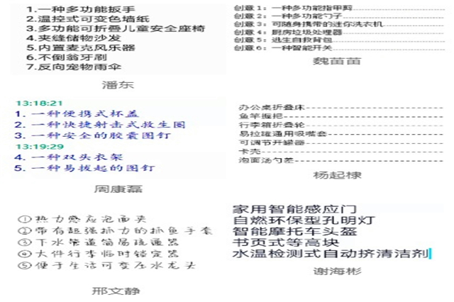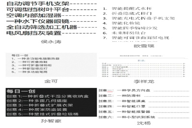 “‘每日一创’是一项非常好的活动。去年,我也参加了全国大学生创新体验大赛,并按照比赛要求每天注意生活中的种种细节,加以自己的奇思妙想柔和改造,并在30天内把自己的想法用笔记录下来,正是因为30天的坚持,我获得了三等奖,让我倍受鼓舞。我认为坚持每日一创的意义在于让我养成了一个良好的创新习惯:随手带笔和纸并及时的把好的想法记录下来,一点一点的写满的小本本逐渐成为我最重要的也是最珍贵的财富。”