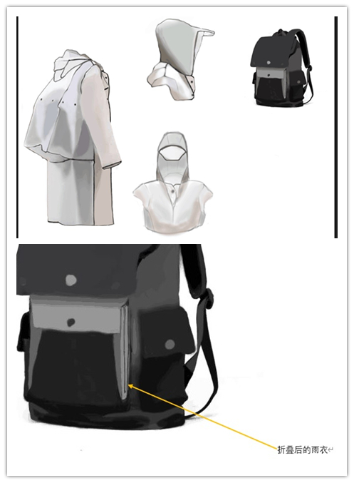 目前,学生所使用的各种书包,仅用来存放文具及物品,均不带防雨装置。学生上下学时,如遇下雨天,又背书包,又打雨具,很不方便。有时突遇下雨,又没带雨具,即连人带包全部淋湿,给学生的生活带来一定困扰,针对这个痛点我设计了一款雨衣书包。